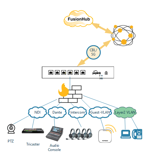 Bild und Tonübertragung für hybride Events erfordern hohe Bandbreiten und Konnektivität unabhängig von Netzen der Hotel- und Hallenbetreiber. OpenAir-Veranstaltungen benötigen Redundanz durch Nutzung mehrerer Übertragungswege. Oft werden auch WLAN-Verbindungen oder Vernetzungen von weiteren Standorten innerhalb der Eventlocation, wie Kassen, Eingangsbereiche etc. benötigt.